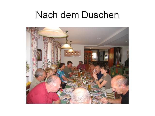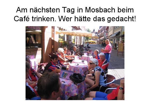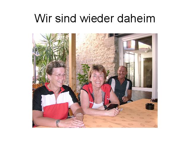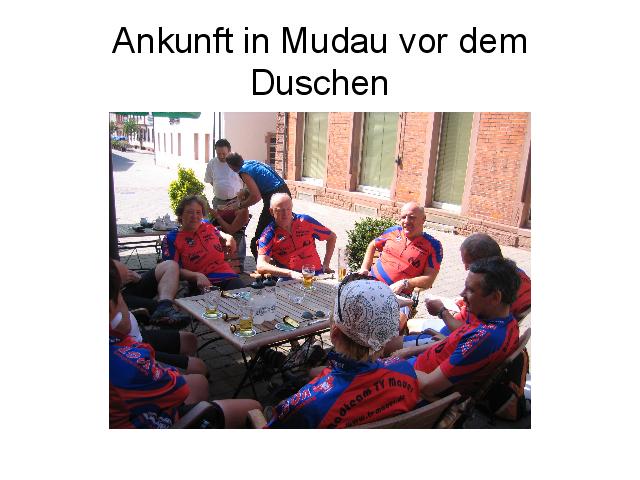 Am Samstag den, 1. Juli um 8 Uhr ging es mit 14 Radlern vom Schulhof in Mauer aus über Neckargemünd am Neckar entlang, Richtung Eberbach. In Pleutersbach, nach ca. 30 km, wurde Kaffee getrunken und gefrühstückt. Dann überquerten wir in Eberbach den Neckar und fuhren Richtung Gaimühle, der Itter entlang, zu "Holzners Mühle" im Höllgrund. Alle schafften den Anstieg problemlos, und an der Mühle bot der Mühlenzulauf die Gelegenheit, uns abzukühlen. Frisch mit Getränken versorgt, ging es nochmals recht steil nach Strümpfelbrunn im Wald hoch; von dort aus nach Mülben zur Kaffeepause. Die größten Kuchenstücke, die wir je gesehen hatten, stellten eine Herausforderung der anderen Art für uns dar. Nachdem wir auch diese Aufgabe gemeistert hatten, stießen noch zwei Nachzügler zu uns, und mit insgesamt 16 Personen radelten wir die letzten Kilometer gemütlich durch den teils tiefen Wald nach Mudau. Im Landgasthof zum Löwen wurden wir herzlich empfangen und hervorragend versorgt. Nach dem Abendessen besuchten wir das Musikfest in Mudau und konnten nach dem Singen des "Mauermer Liedes" beruhigt schlafen gehen. Am Sonntag, den 2. Juli wurden unsere Drahtesel um 9 Uhr wieder gestartet. Von Mudau bis Mosbach fuhren wir die Wanderbahn ca. 30 km leicht bergab. Nach einer Kaffeepause ging es von Mosbach dann weiter Richtung Neckarzimmern, in Haßmersheim einen knackigen Anstieg hinauf, an der Burg Guttenberg vorbei, zur Mittagspause in Bad Rappenau. Nach reichlicher Getränkeaufnahme und leichtem Mittagessen traten wir die Heimreise nach Mauer an. Mit insgesamt ca. 145 geradelten Kilometern beschlossen wir unseren Ausflug in der "Krone Post" und möchten uns alle recht herzlich bei Maritta Vettermann bedanken, die diesen Ausflug ausgearbeitet und hervorragend organisiert hat. Bis zum nächsten Jahr, ihre Berichterstatterin Christine Banschbach. |