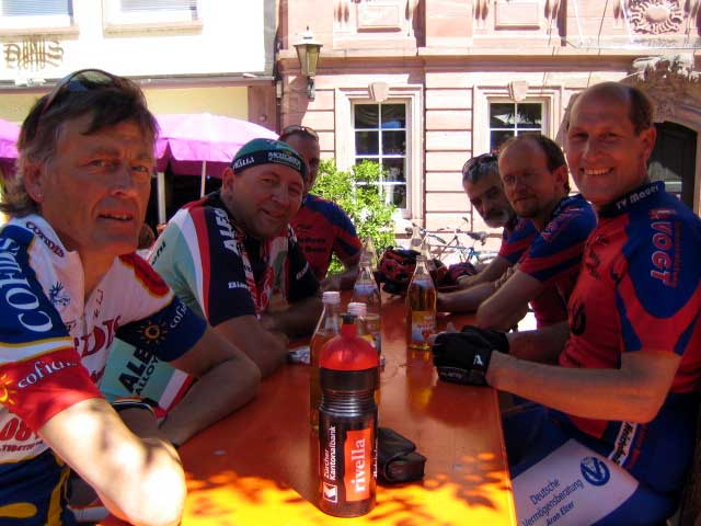Radteam TV Mauer aktuell:Und wieder sind ereignisreiche Tage vorbei. Zwischen Umgehungsstraße und Radweg nach Meckesheim grüßen seit letzten Sonnabend die "Zinnen von Mauer", der künftige Bike- oder Dirtpark. In Zusammenarbeit mit den Mauermer Jugendlichen Dennis, Beni, Christian und Max haben Herbert und Bernhard jetzt die losen Erdhaufen beim Schützenhaus zu Sprunghügeln zusammengeschoben. Dank auch den Firmen Hartmann und Ernst Karolus für die Unterstützung durch das Zurverfügungstellen von Planierraupe und Bagger. In den nächsten Wochen muss sich das Material jetzt setzen. Danach wird das Gelände noch weiter modelliert. Wir sind auf das Ergebnis gespannt und wünschen schon heute viel Spaß bei der Nutzung - Ungeübte sollten dabei aber nicht übermütig werden und das eigene Können aus den Augen verlieren. Herbert stürmte danach mit Roland der 14-köpfigen Radgruppe hinterher, die sich unter Führung von Maritta Vettermann schon am Morgen auf den Weg zu einer Zweitagestour nach Mudau machte. Über Neckargemünd gings zunächst immer auf dem Radweg den Neckar entlang. Dieser wurde schließlich in Eberbach überquert. Der Itter entlang erreichte das Team schließlich Gaimühle, wo der Aufstieg in den Odenwald begann. Durch mehrere Stopps war auch dies kein Problem. Kurz vor dem Mudau stießen dann die beiden Nachzügler auf das Peloton und fuhren dann gemeinsam durch schattigen Wald ins Etappenziel. Am Abend kam auf dem Musikfest in Mudau dann auch die Geselligkeit nicht zu kurz, bevor es hieß Schlafen zu gehen. Am nächsten Morgen ging es dann über Mosbach den Neckar entlang zurück bis Haßmersheim. Dort wurde die Neckarseite erneut gewechselt und ein knackiger Anstieg - vorbei an der Burg Guttenberg - führte die Radler nach Bad Rappenau zur Mittagsrast. Am Nachmittag kehrten alle 16 Teilnehmerinnen wohlbehalten wieder nach Mauer zurück. Die Erlebnisse der beiden letzten Tage bzw. der gefahrenen 145 km wurden danach noch bei Smajo heftig diskutiert. Der ausführliche Bericht mit Bild hier .... Eine Gruppe Rennradler fuhr am letzten Sonntag die seit Monaten geplante Tour nach Miltenberg. Die 7 Teilnehmer hatten sich die Steigung nach Haag als erste Herausforderung ausgewählt, die in kühler Morgenluft anstandslos bewältigt wurde. Es ging weiter in rasender Fahrt hinunter nach Eberbach und von dort aus trotz der bevorstehenden Anstrengungen in flottem Tempo weiter nach Gaimühle. Hier wartete die zweite Herausforderung, der Anstieg zum Hesseneck. Eskortiert von Unmengen Motorradfahrern, die unterwegs an einem bekannten Treff in Kailbach ihr Frühstück einnahmen, erreichen wir aber auch das "Dach unserer Tour ohne Probleme. Danach stürmten wir weiter bis Amorbach. Auf verkehrsarmer Strecke parallel zur dortigen Bundesstraße erreichten wir schließlich Miltenberg. Nach einem Besuch des Altstadtfestes und dem obligatorischen Erinnerungsfoto (siehe Anhang) ging es auf derselben Strecke zurück nach Eberbach. Die letzen Kilometer folgten wir dem Lauf des Neckars und gelangten dann über Neckargemünd und Bammental wieder nach Mauer zurück. Die zurückgelegten 150 km wurden dabei in knapp 5 1/2 h bewältigt. ![]()